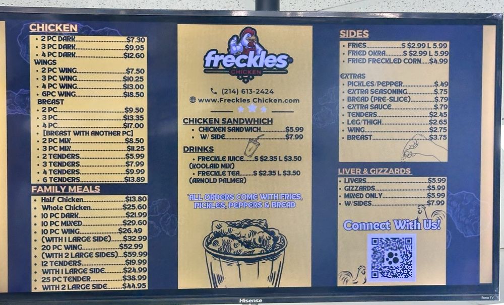 Welcome to Freckles Chicken, the gem of Mesquite, TX, where chicken lovers unite! Situated conveniently off I-30, this establishment specializes in delectable chicken wings paired with an array of mouthwatering sides. The menu features everything from crispy thighs to succulent tenders, ensuring a flavor-packed experience with every bite. Customers rave about the freshness and seasoning, highlighting the gizzards and fried corn as must-tries.